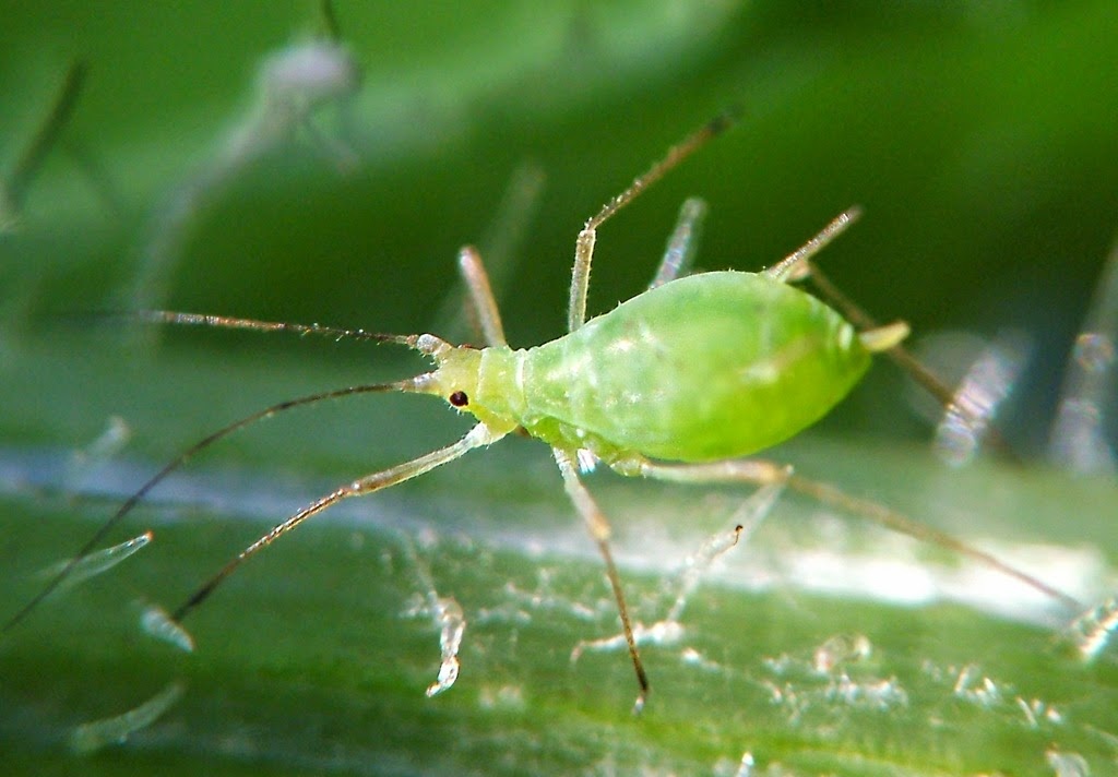 El pulgón verde es liso de color verde brillante, normalmente lo encontramos en las yemas de las flores, en invierno eclosionan sus huevos y durante primavera crece esta plaga exponencialmente